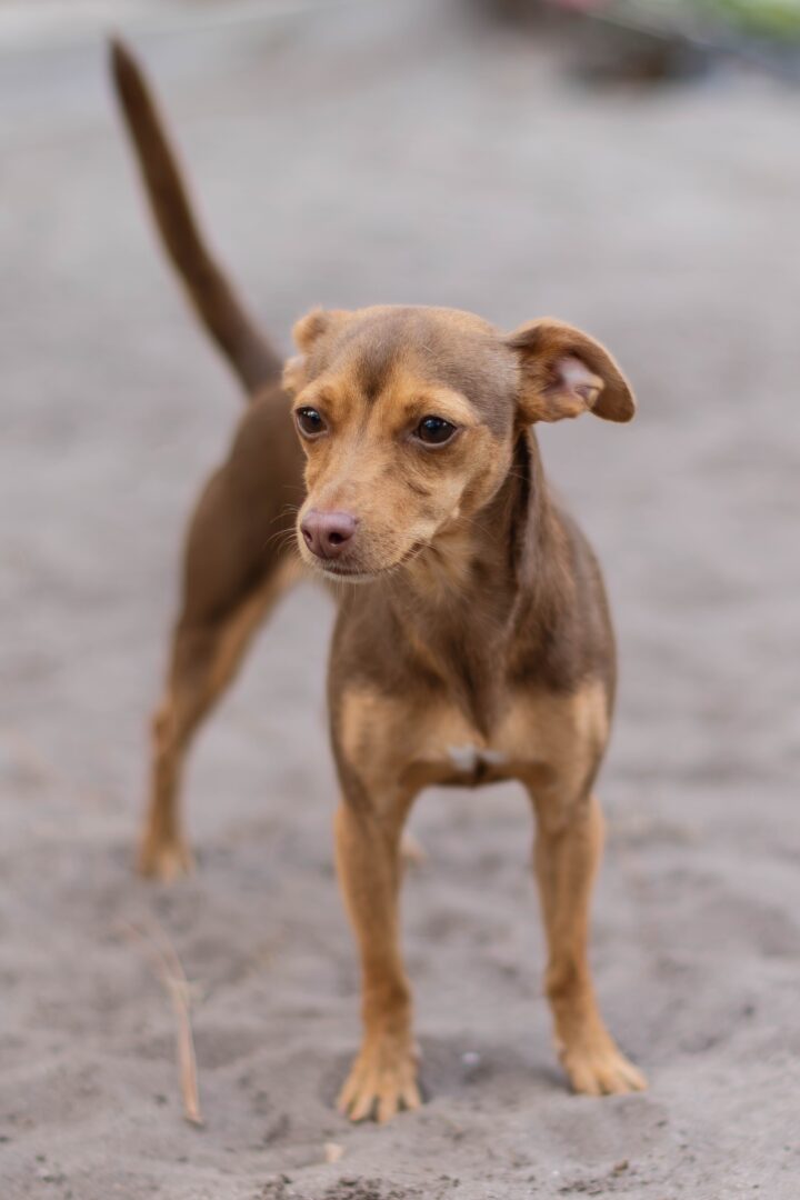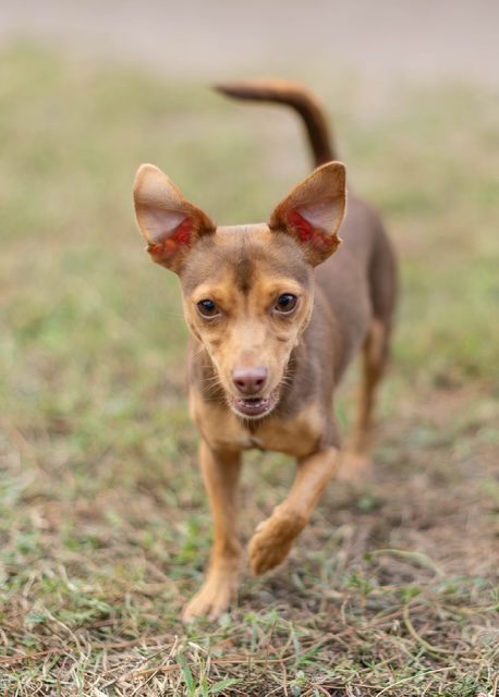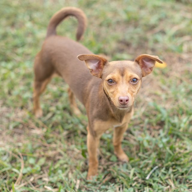 Meet Sandy! Sandy was recently surrendered to E.A.R.S. She is a 3-year-old Chinpin (Miniature Pinscher/Chihuahua mix). Sandy loves spending time with the volunteers and enjoys going for walks. However, climbing into a lap is still her favorite thing to do. Sandy does well with other small dogs (we are unsure how she will do with larger dogs or cats.) She will make a fun addition to any family or a wonderful companion.